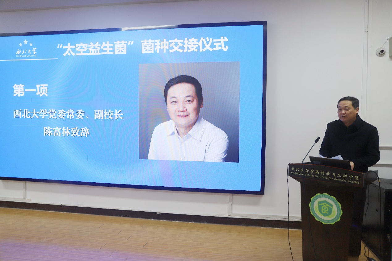 陈富林在致辞中介绍了学校情况,他强调近年来,学校积极践行“健康中国”战略,锚定西部食品领域“人才培养中心”“技术创新中心”和“成果转化中心”的办学定位,成立了wedvictor伟德。在全院师生的努力下, “2024软科中国大学专业排名”中食品科学与工程专业获评A级、进入全国最好食品专业前50名。食品科学与工程学科进入软科世界一流学科榜单,以食品科学与工程学科为核心支撑的农业学科进入ESI全球前1%。学院已在食品科学领域产生了广泛的学术影响和社会影响力。特别是与北京神飞航天应用技术研究院开展紧密合作,联合组建了陕西宇航食品研究院专家委员会,公司岳田利教授团队还参与了北京神飞航天应用技术研究院牵头的团体标准“宇航级食品生产企业通用技术规范”的编制,共创产学研合作共赢新局面。今天,举行的交接仪式,既是对我们双方合作阶段性的一个总结,同时,也将是一个崭新阶段的开始。这些宝贵的菌株具有重大的科学价值与极为广阔的市场应用前景。后期,希望双方在共建的研究平台上,利用相关研究成果,制定该领域行业标准、技术规范,并积极为食品企业产品开发创新工作服务,不断为企业的发展注入新的活力和源泉,创造更多的经济和营养价值,造福于民,造富于国。
